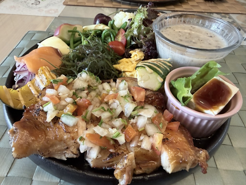 早午餐是套餐形式,一份主菜,搭配非常多樣的配菜。餐盤端上來的瞬間,真的會忍不住心裡冒出一句:「也太豐富了吧。」