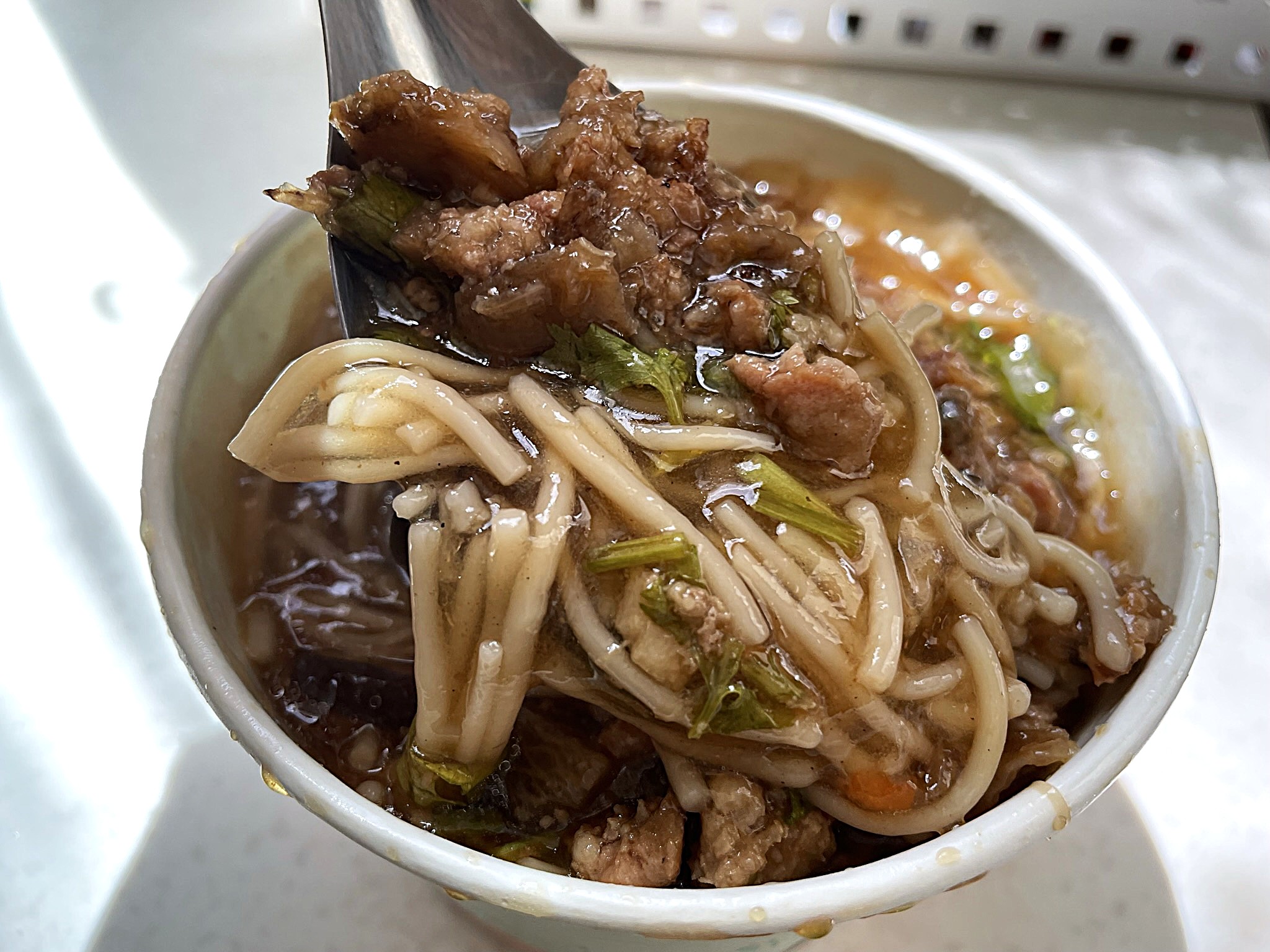 這碗米粉羹好吃的關鍵,在於勾芡的剛好,層次分明,不是那種厚到會黏嘴的,也不是稀到像湯。配料誠意十足,除了鋪在最上層滿滿的肉燥,是用梅花肉塊熬製的,口感紮實,用湯匙翻一下,會看到裡面的滿滿的料:蘿蔔乾、木耳、香菇。
